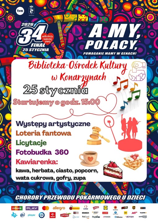 Już w niedzielę, 25 stycznia 2026 r., zapraszamy wszystkich mieszkańców – małych i dużych – do Biblioteki-Ośrodka Kultury w Konarzynach na 34. Finał Wielkiej Orkiestry Świątecznej Pomocy.
