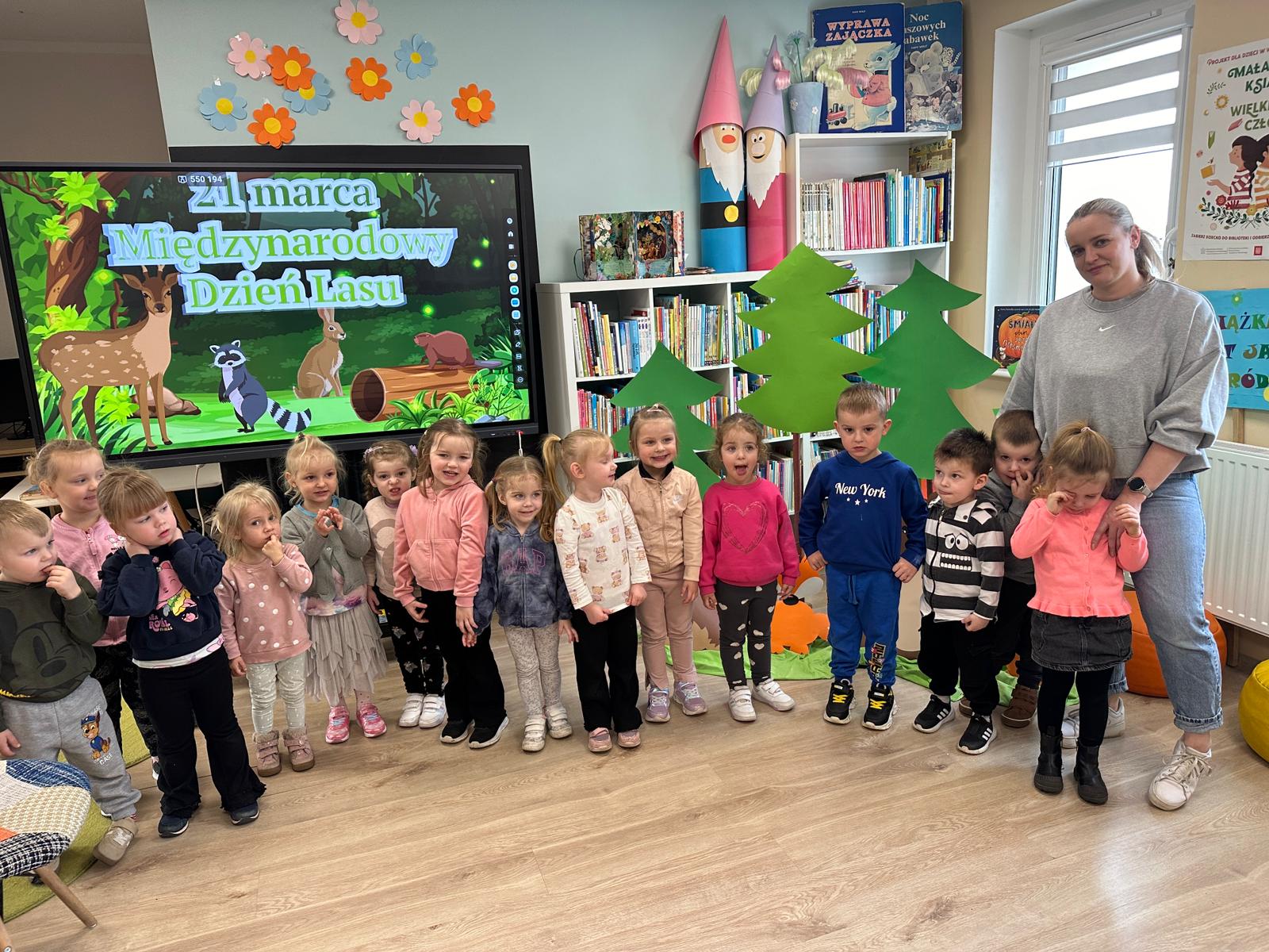 Dzieci z uwagą wysłuchały książki o leśnych przygodach, a następnie wzięły udział w różnych aktywnościach edukacyjnych. Dopasowywały tropy zwierząt leśnych, łączyły cienie z odpowiednimi kształtami drzew odkrywając tajemnice przyrody.