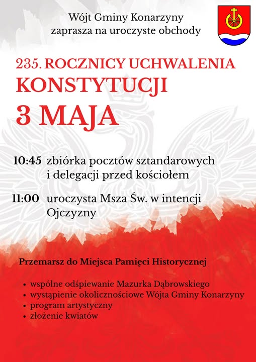 Serdecznie zapraszamy mieszkańców gminy Konarzyny oraz wszystkich gości do wspólnego świętowania tego wyjątkowego dnia.