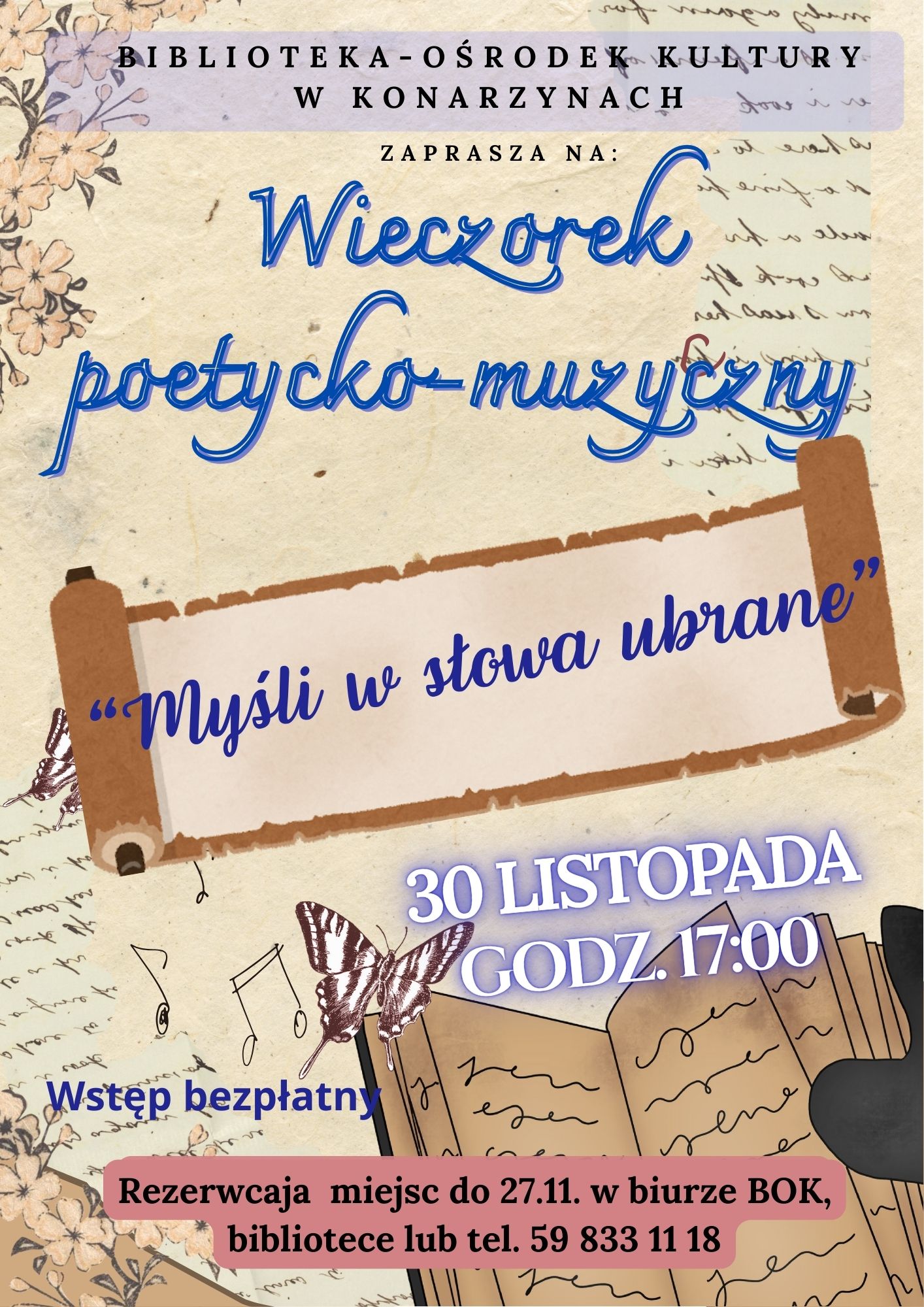 Serdecznie zapraszamy na wieczorek poetycko-muzyczny „Myśli w słowa ubrane”!