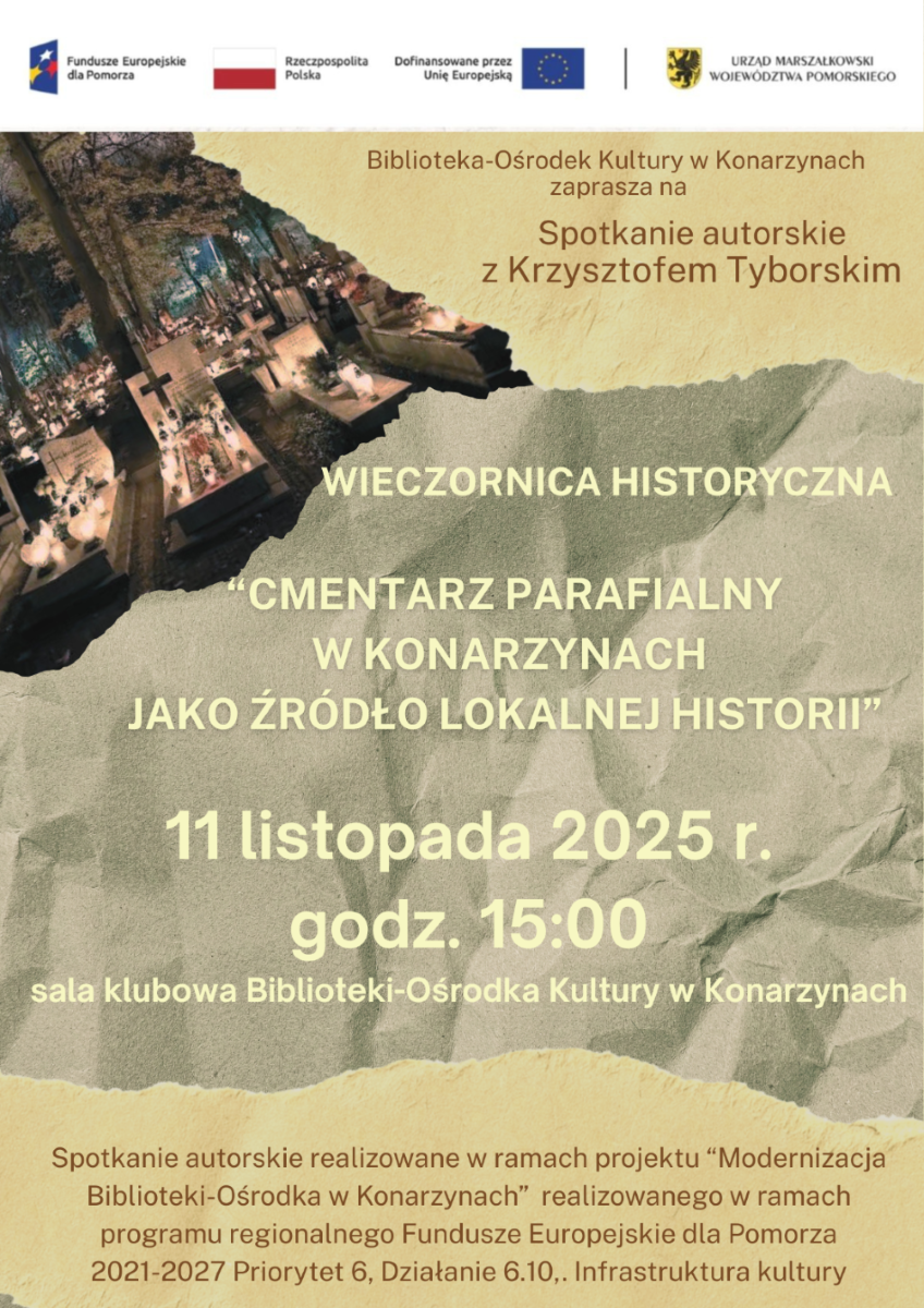 Spotkanie autorskie realizowane w ramach projektu "Modernizacja Biblioteki-Ośrodka Kultury w Konarzynach" w ramach programu regionalnego Fundusze Europejskie dla Pomorza 2021-20027 Priorytet 6, Działanie 6.10. Infrastruktura kultury
