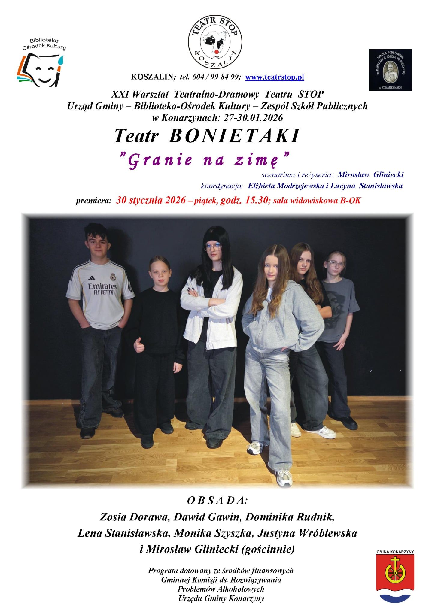 Na naszej scenie wystąpią młodzi aktorzy – uczestnicy warsztatów teatralno-dramowych prowadzonych przez Teatr STOP z Koszalina. Przez kilka dni pracowali nad emocjami, ruchem i słowem, a teraz… czas na finał „Granie na zimę” – Teatr BONIETAKI