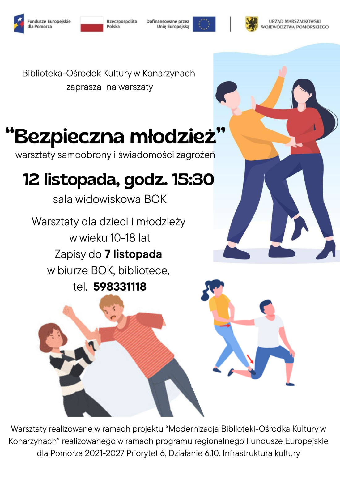 Warsztaty samoobrony dla młodzieży realizowane w ramach projektu "Modernizacja Biblioteki-Ośrodka Kultury w Konarzynach" realizowanego w ramach programu regionalnego Fundusze Europejskie dla Pomorza 2021-2027, Priorytet 6, Działanie 6.10. Infrastruktura Kultury